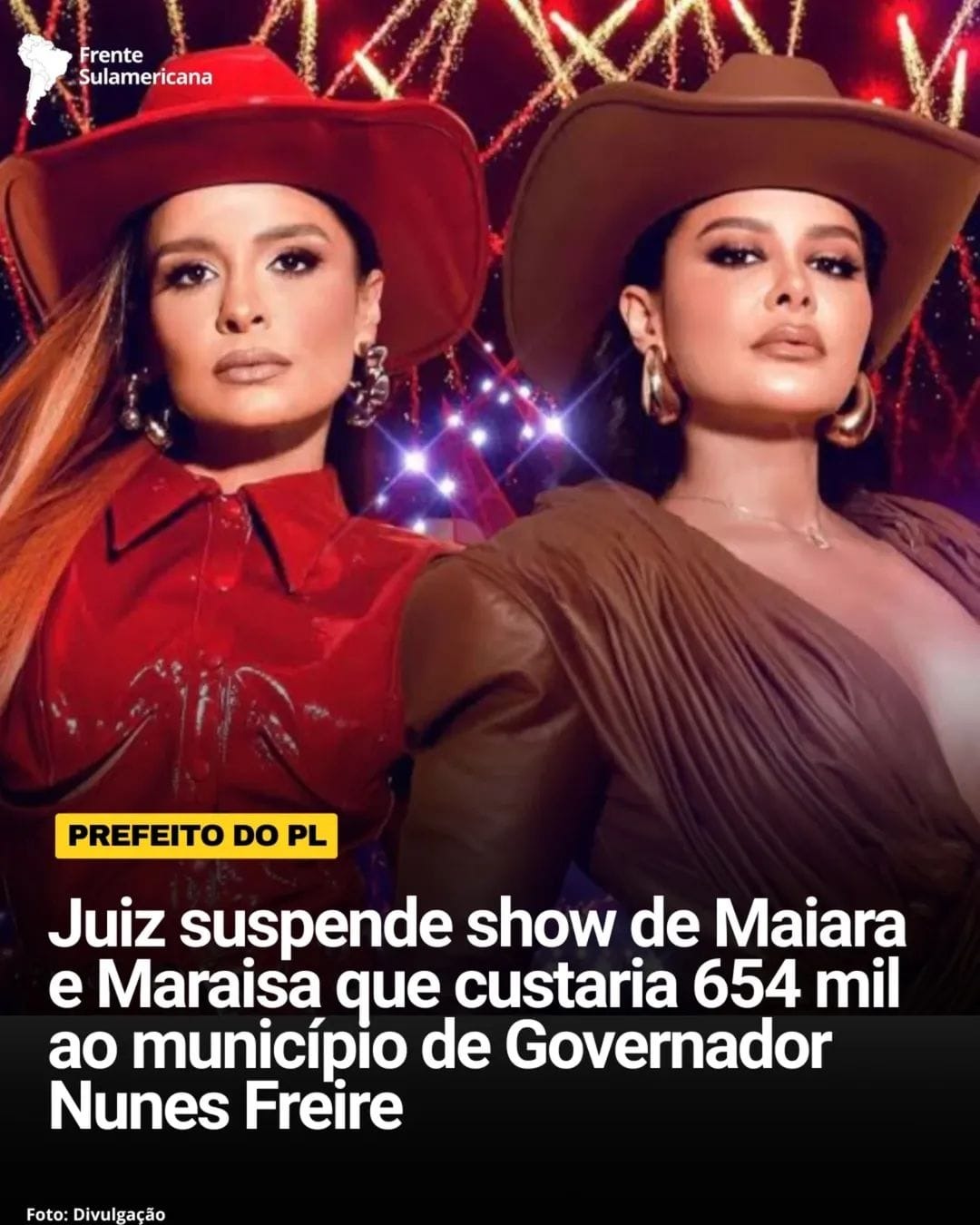O juiz Bruno Chaves, da Vara Única da Comarca de Governador Nunes Freire, no Maranhão, suspendeu o show da dupla Maiara e Maraisa que seria pago pela prefeitura do município.