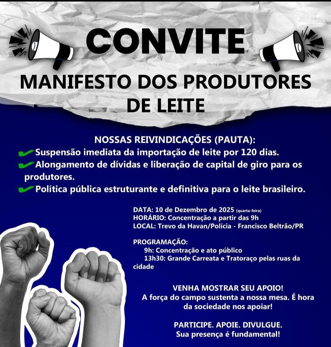 Produtores de leite têm manifestação às 9h do dia 10/12 em Francisco Beltrão PR.