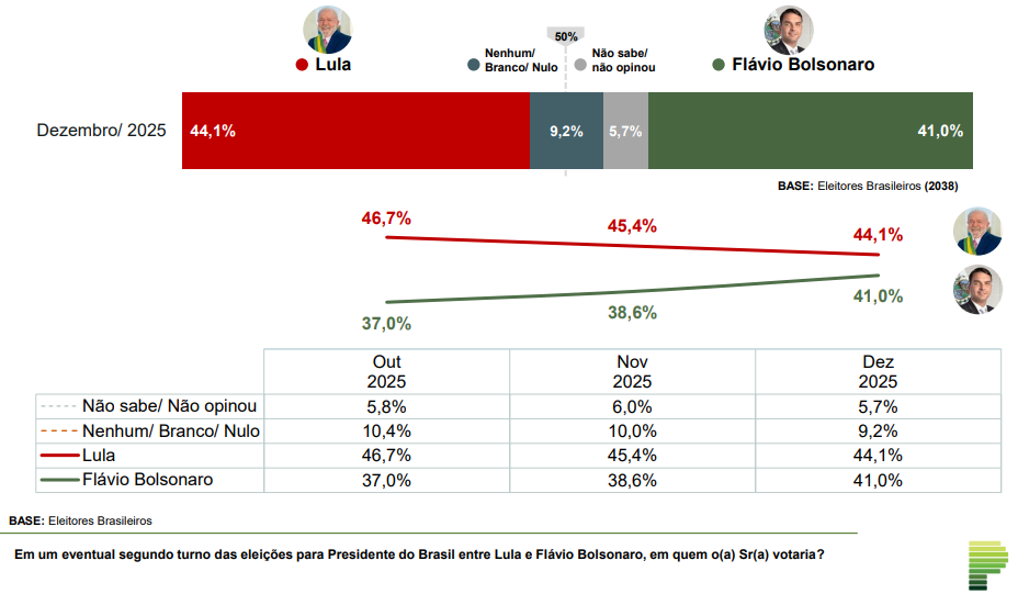 A polarização entre Lula e Flávio Bolsonaro num eventual segundo turno mostra um país dividido, mas com uma clara tendência de aproximação do candidato oposicionista.