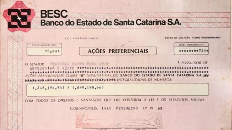 Cártula do Besc, banco extinto em 2008 e incorporado pelo Banco do Brasil