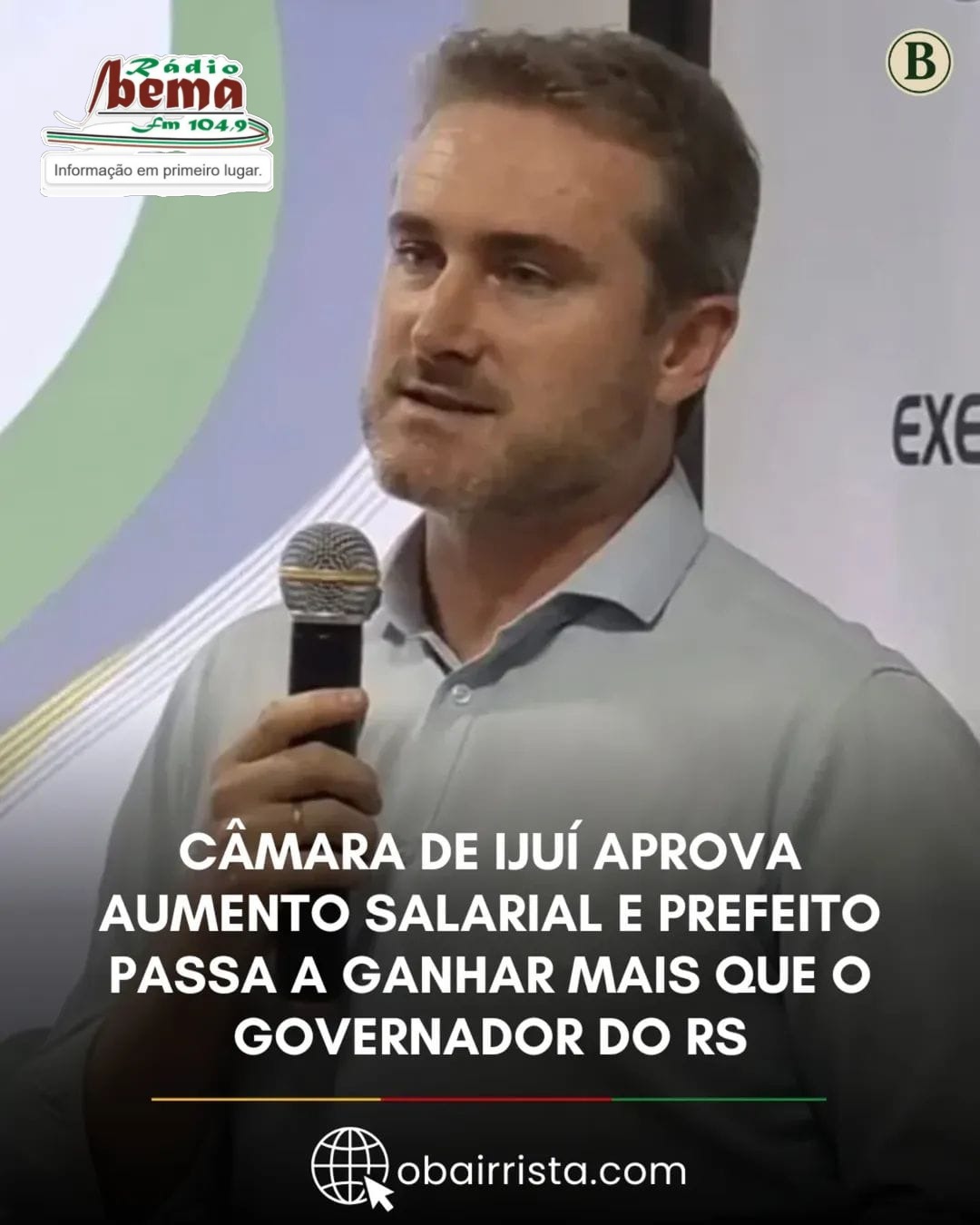 A Câmara de Vereadores de Ijuí RS aprovou um projeto de lei que reajusta os salários do prefeito, vice, secretários e vereadores, elevando a remuneração do chefe do Executivo municipal para R$ 37,4 mil. Com o aumento, o prefeito Andrei Cossetin (PP) passa a ganhar mais do que o governador do Rio Grande do Sul, Eduardo Leite (PSD), cujo subsídio é de R$ 35,4 mil.