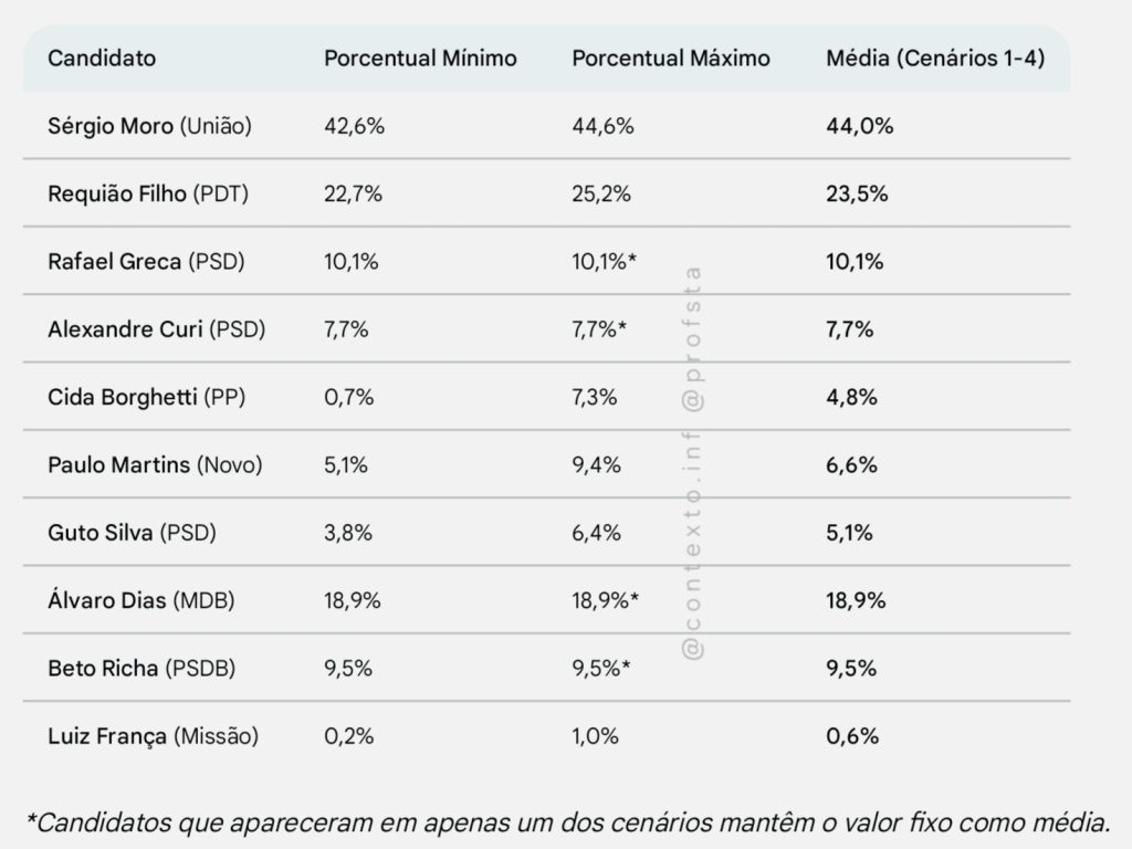 Os números mostram Moro isolado na liderança em todos os cenários em que seu nome é testado, alcançando entre 42% e 44% das intenções de voto. Requião Filho aparece como a principal força de oposição, mantendo-se firme na segunda colocação com cerca de 25%.