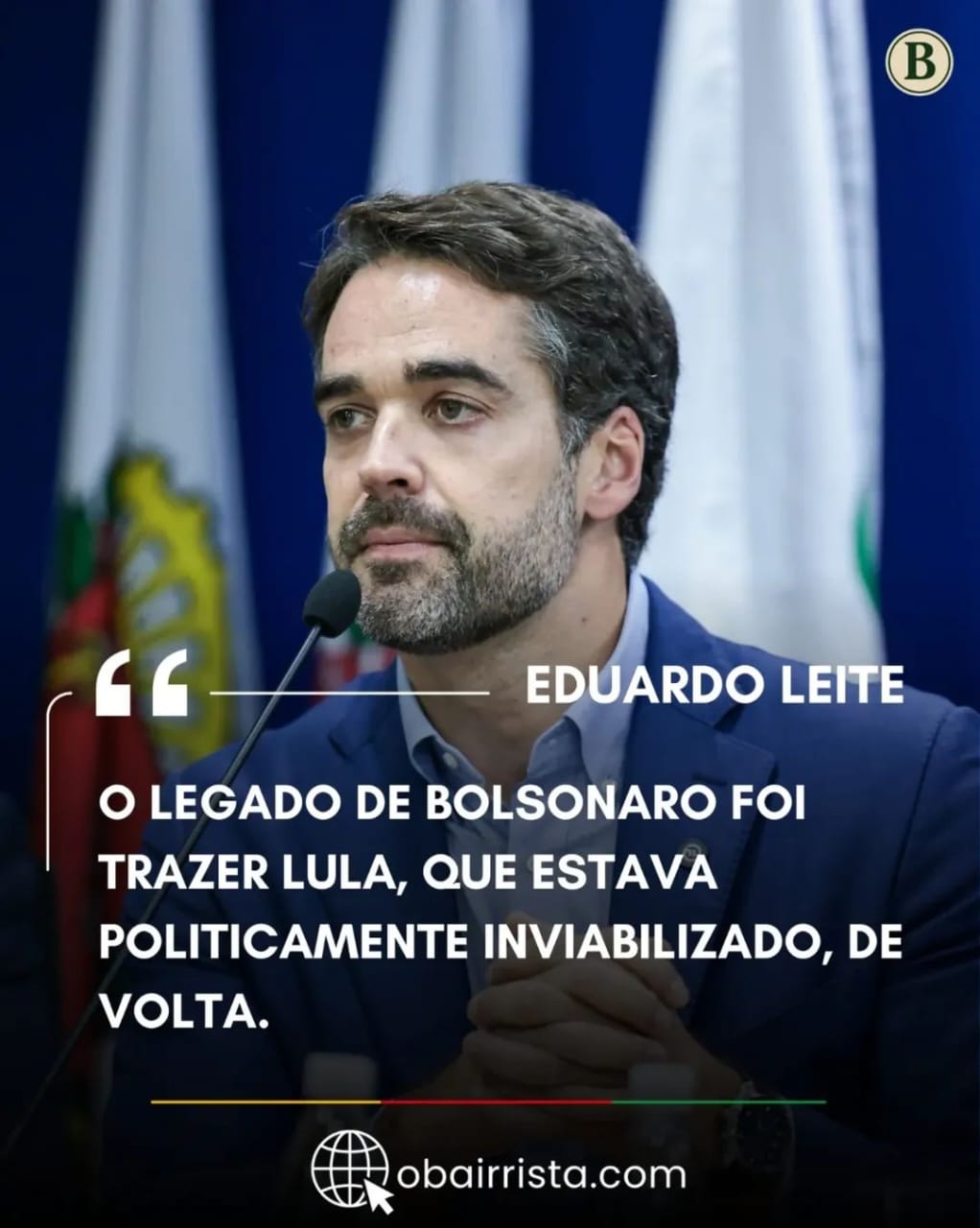 Durante a fala, Leite afirmou que Lula estava “politicamente inviabilizado” antes da eleição de 2022 e que o cenário de polarização contribuiu para seu retorno ao poder. Segundo o governador, caso o atual presidente mantenha uma agenda baseada na divisão política, pode acabar fortalecendo novamente o campo bolsonarista.