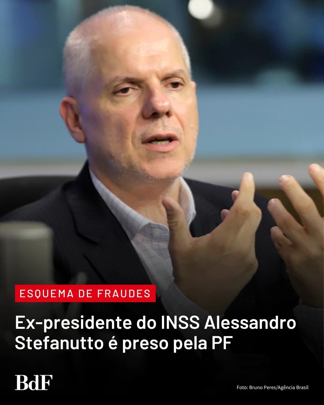 Hoje (13), o ex-presidente do INSS Alessandro Stefanutto foi preso pela PF, como parte da ação que investiga o esquema de descontos irregulares em aposentadorias e pensões por associações. Ele foi demitido do cargo em abril, pelo então ministro da Previdência Social, Carlos Lupi, quando o esquema foi revelado.